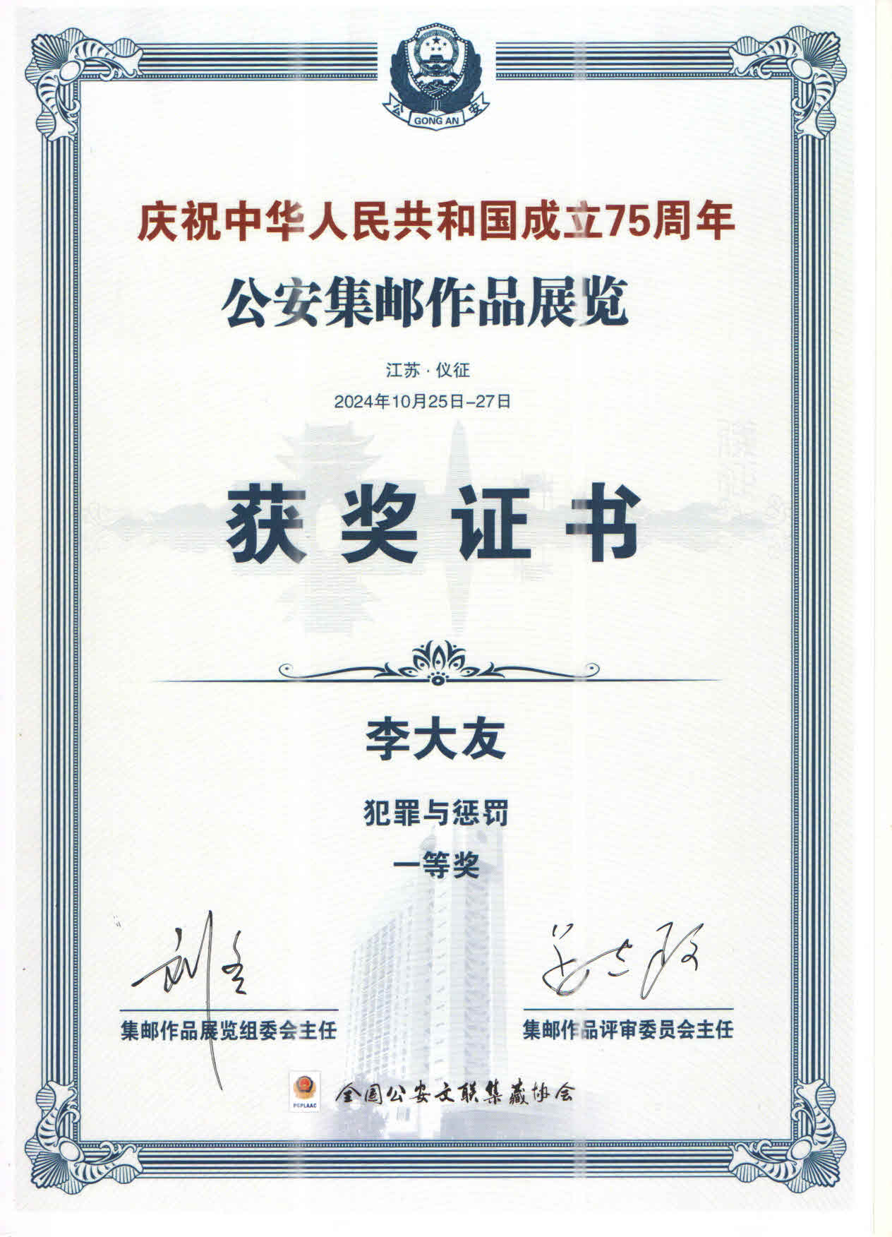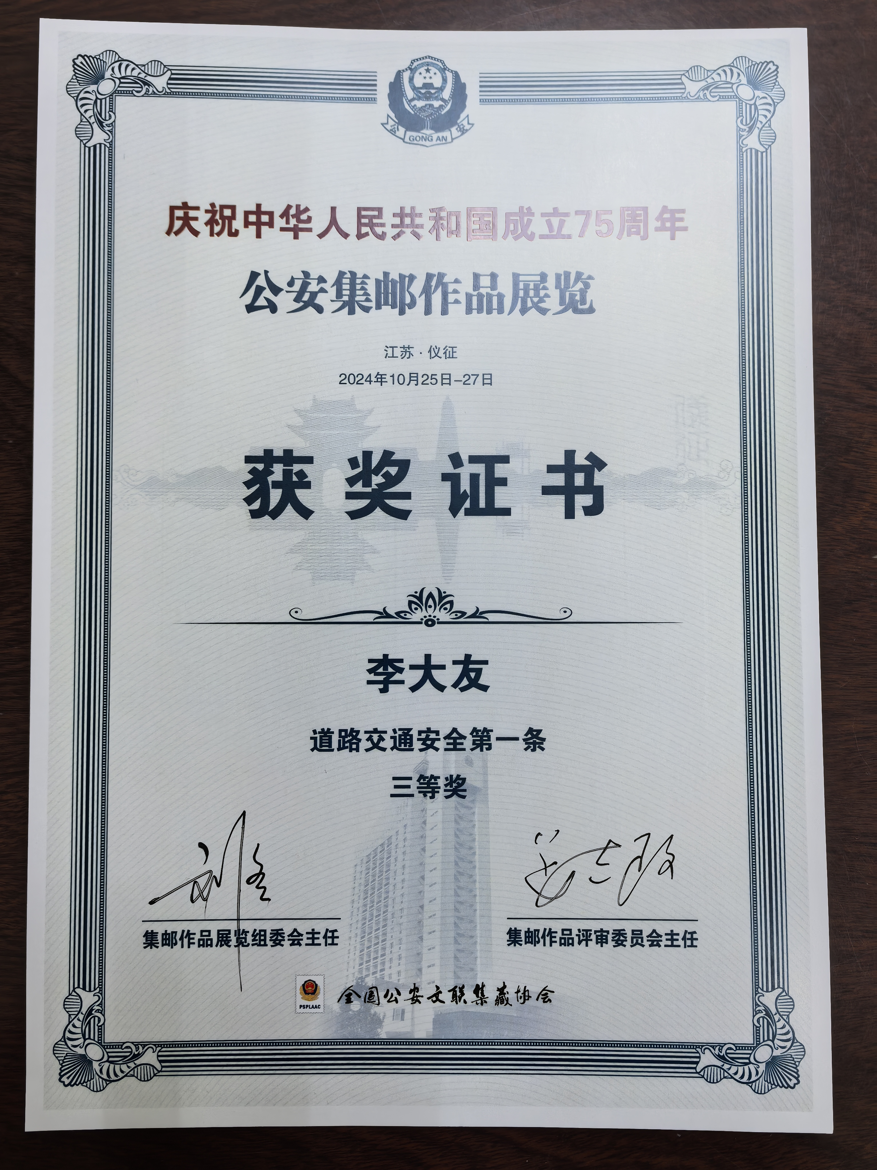 在“庆祝中华东谈主民共和国设立75周年公安集邮作品展览”活动中,李大友主题邮集作品《犯科与刑事牵涉》(5框)获一等奖,《小偷别跑》(1框)获二等奖,《谈路交通安全第一条》(1框)获三等奖。