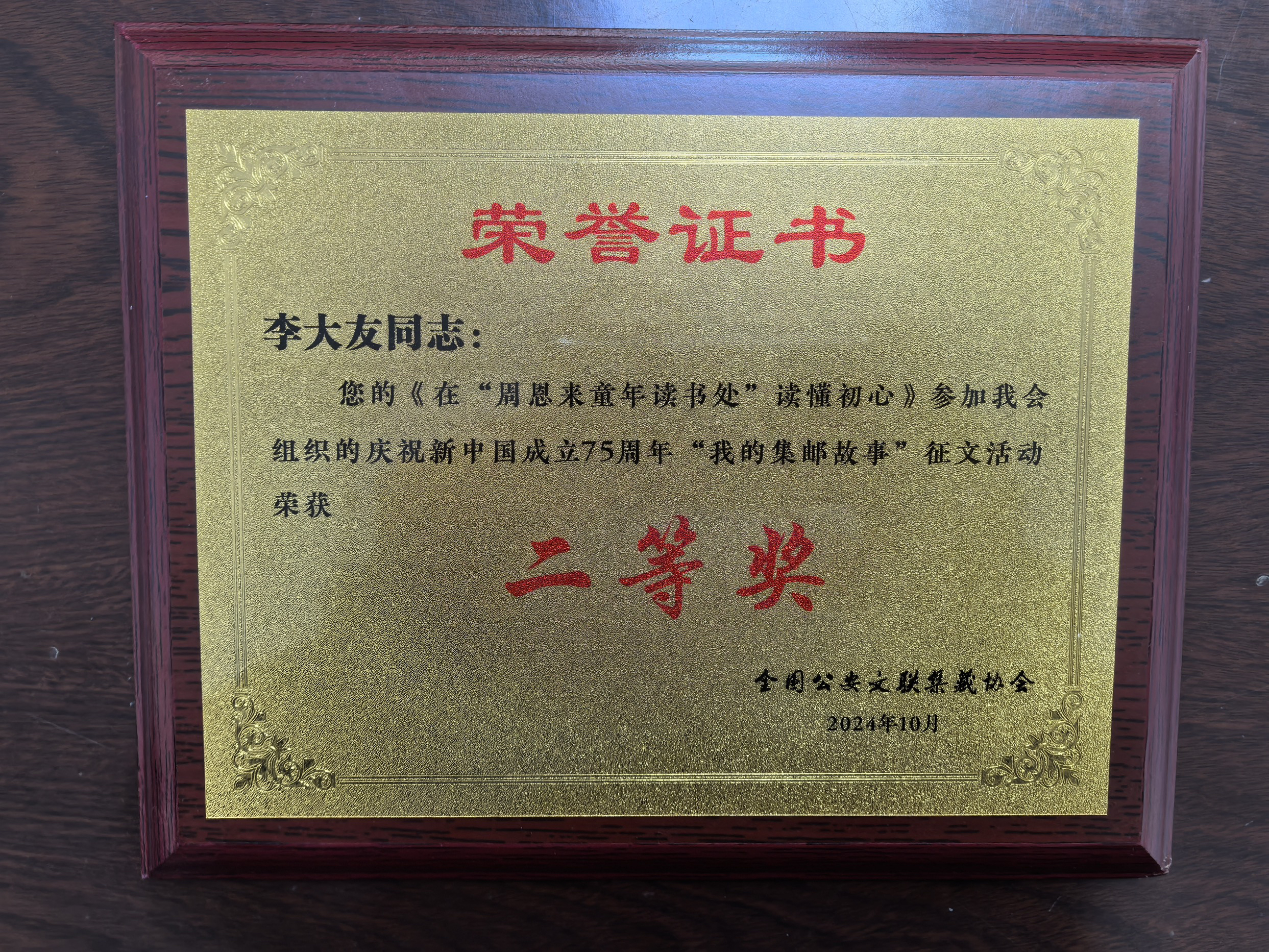 在“庆祝中华东谈主民共和国设立75周年-我的集邮故事”征文活动中,李大友的2篇征文《在“周恩来童年念书处”读懂初心》、《以警彰邮 以邮塑警》均获二等奖。