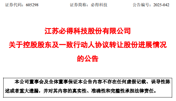 据必得科技8月9日公告,2025年8月8日,必得科技内容规章东说念主王坚群、刘英过火一致行径东说念主王恺、王坚平、李碧玉,与扬州鼎龙启顺股权投资搭伙企业(有限搭伙)(以下简称“鼎龙启顺”)签署了《股份转让合同》,王坚群、刘英、王恺、王坚平、李碧玉拟向鼎龙启顺转让其捏有上市公司总共 56,167,150 股股份,占上市公司总股本的29.90%。